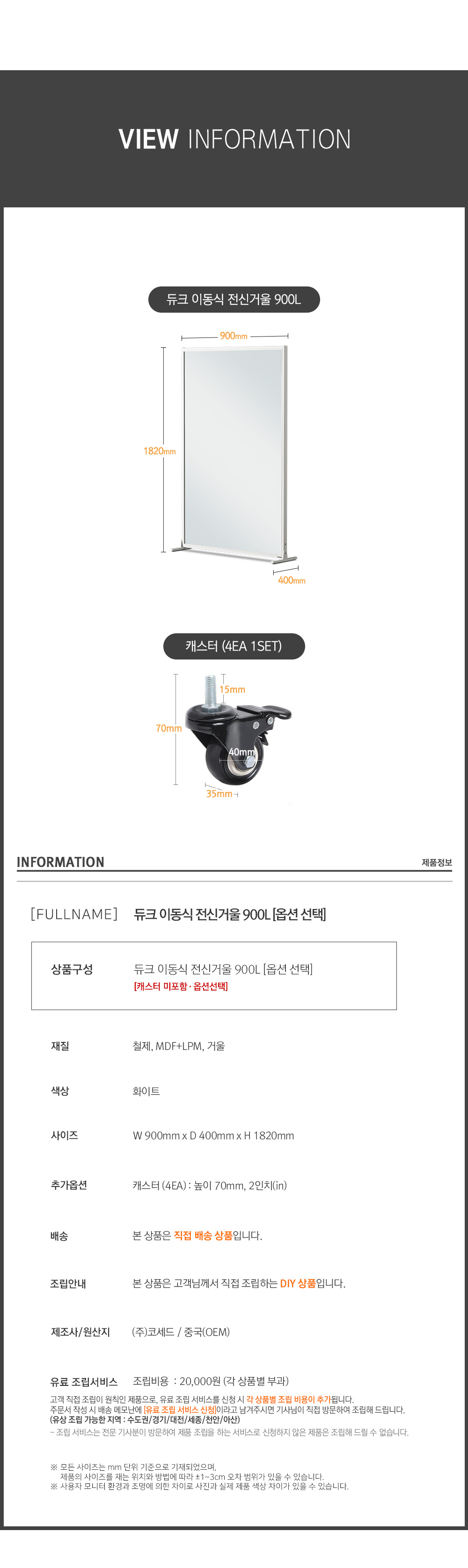 듀크 이동식 전신거울 900 [화이트]
