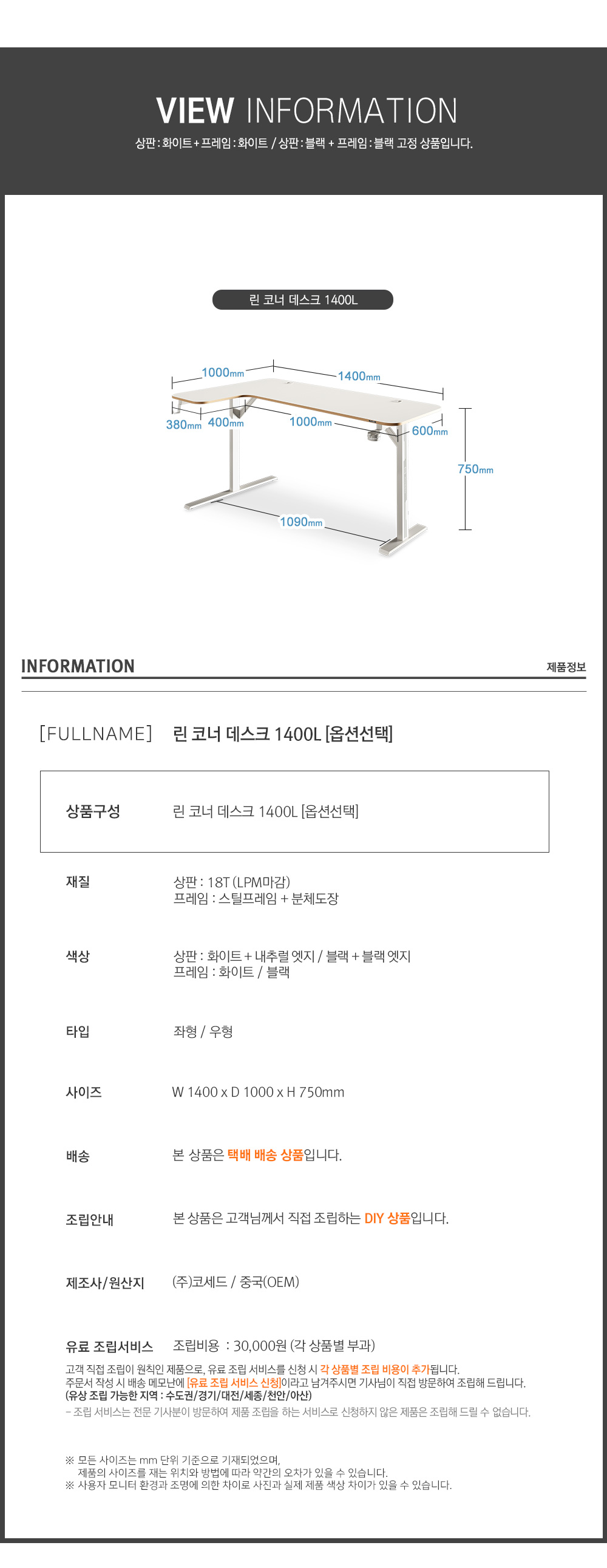 린 코너 데스크 1400 사이즈 (화이트/블랙)