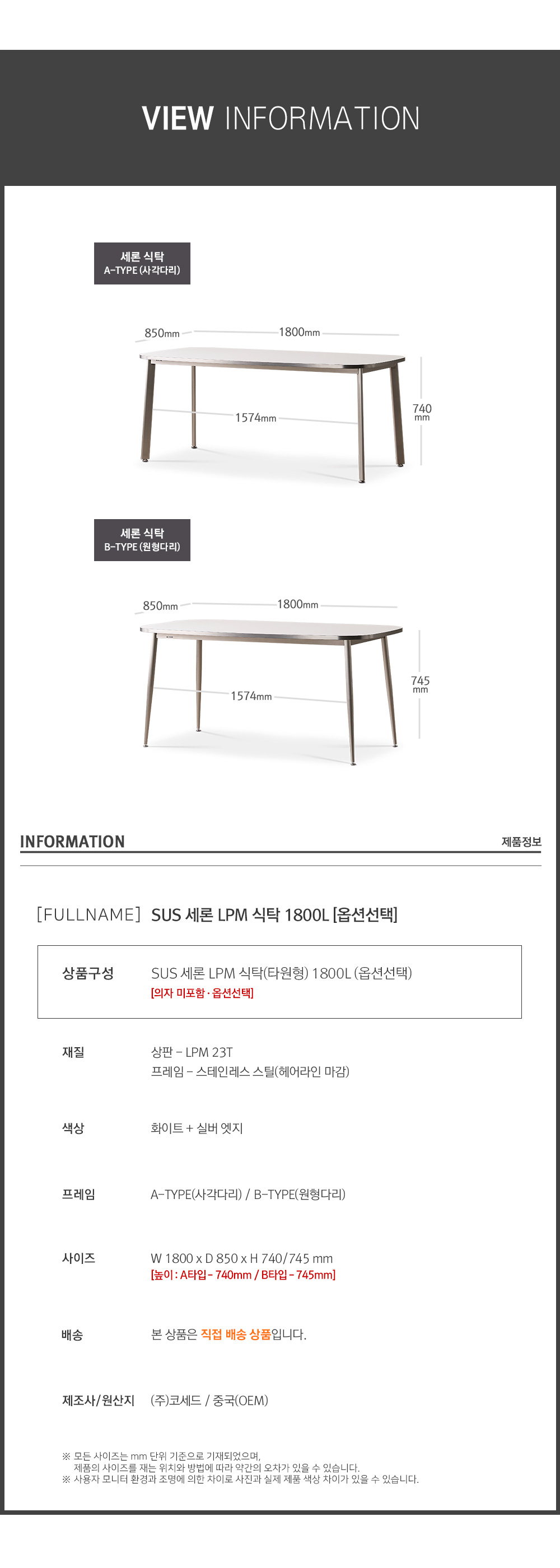 HOME > KITCHEN > 인테리어 식탁 > 6인식탁 > SUS 세론 LPM 식탁 타원형 1800
